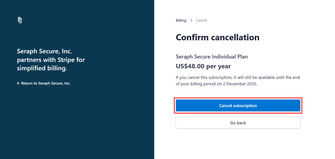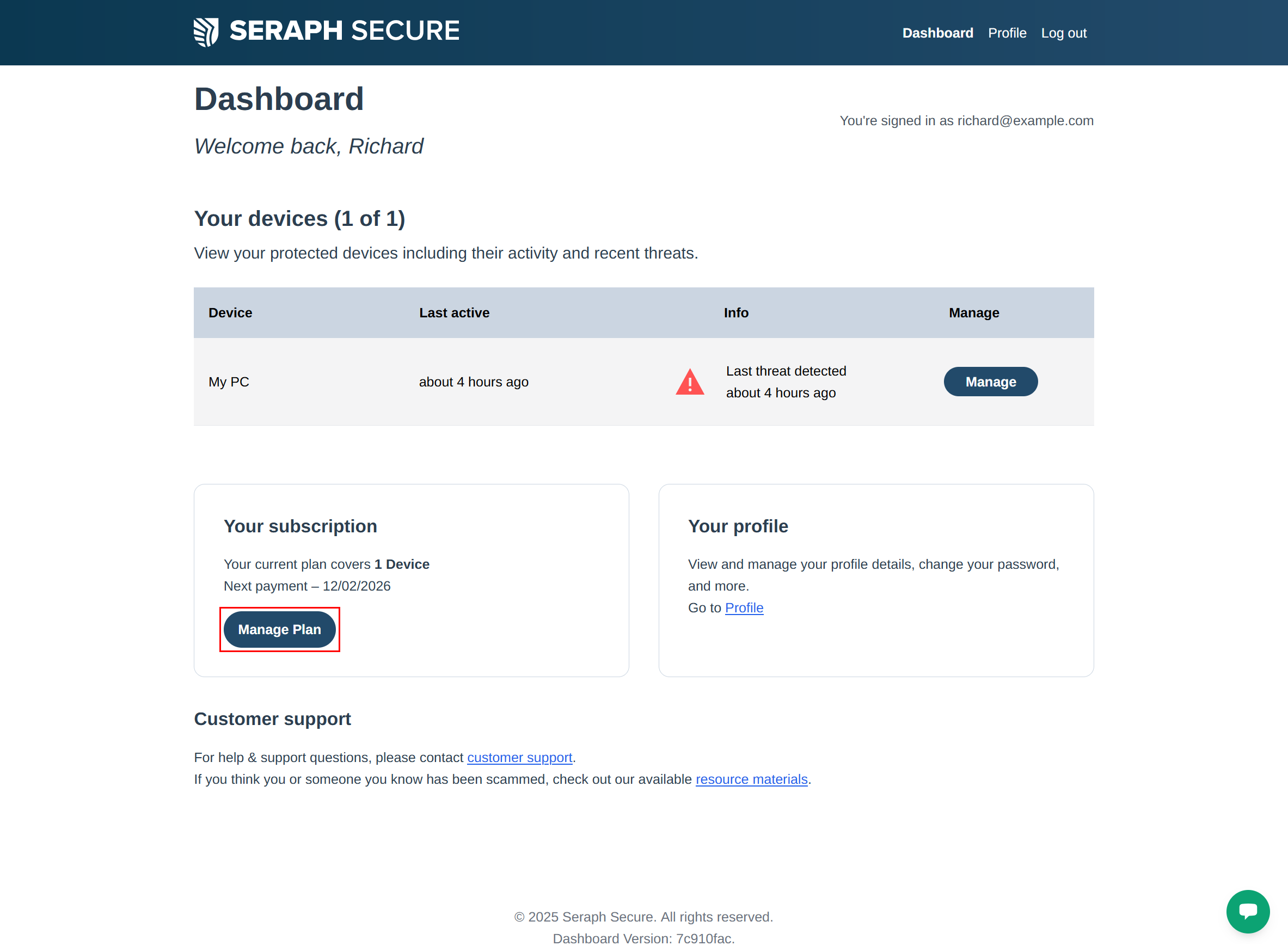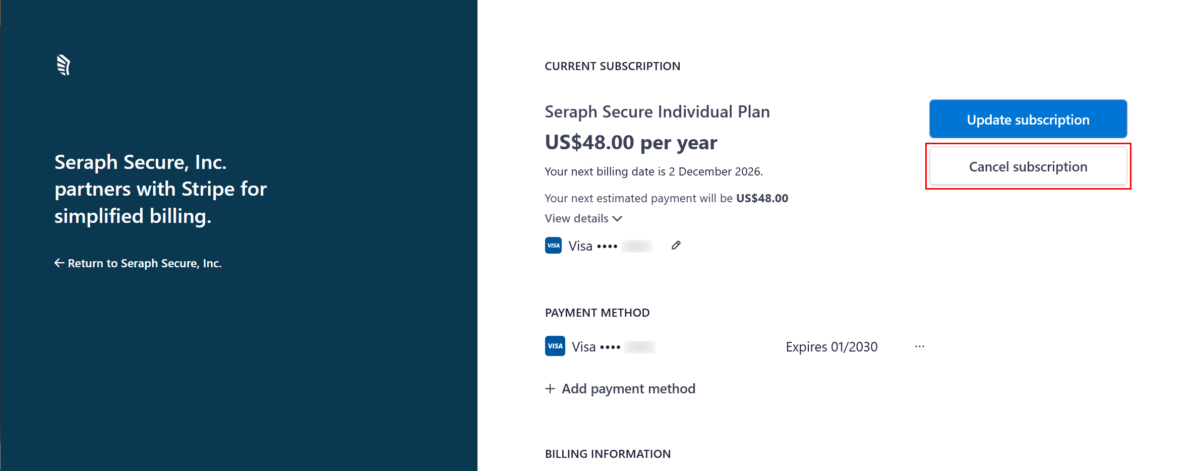 Your Seraph Secure Premium subscription can be managed from your Seraph Secure Dashboard.